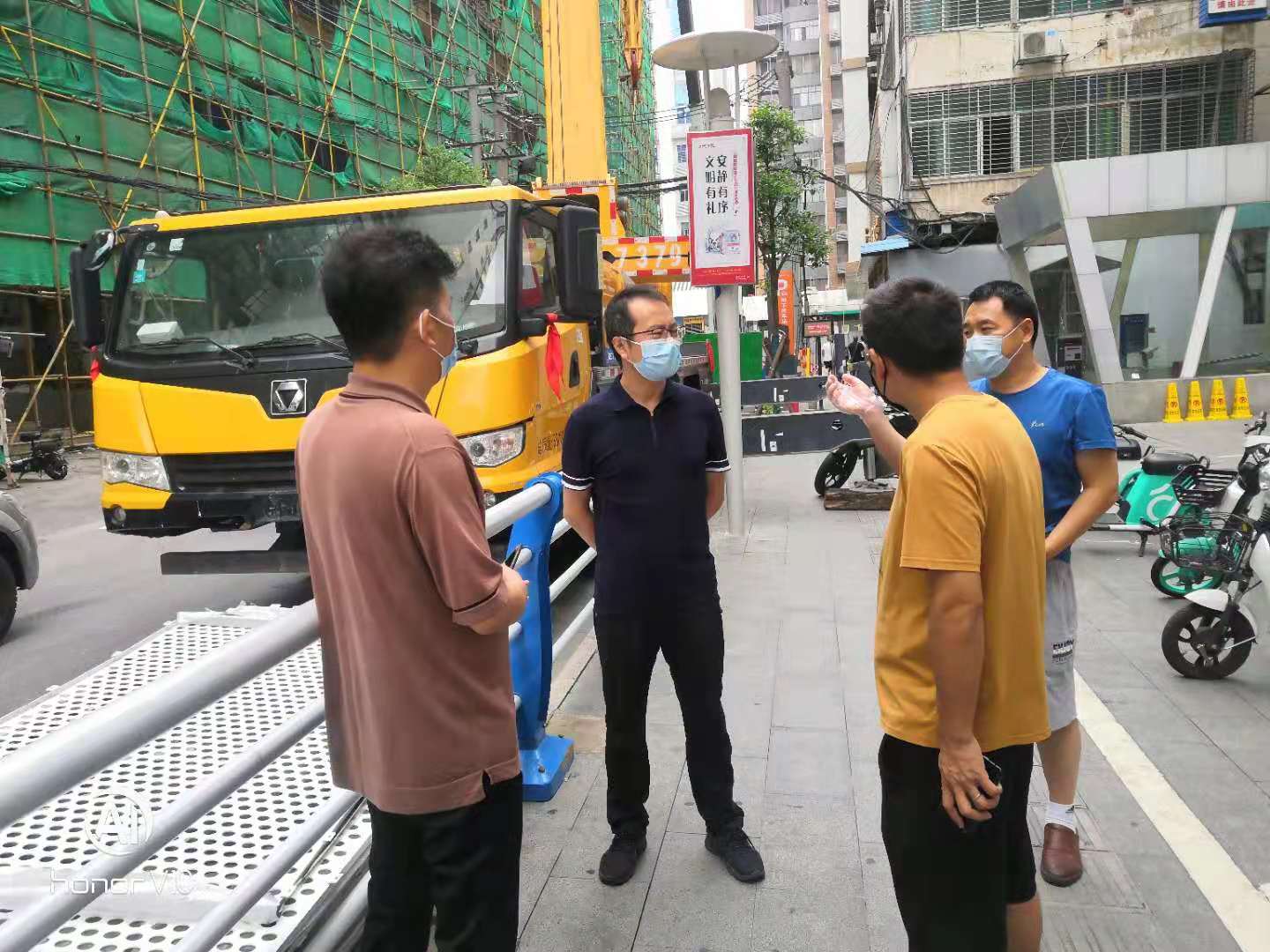 首先在中商外立面改造施工現(xiàn)場,聽取中鴻裝飾公司的施工進度工作匯報后,陳施俊同志要求,在圍繞按期完成施工任務的同時,要加強員工疫情防控知識宣傳教育,提高員工個人防護意識,督促員工做好健康監(jiān)測。對施工場地、辦公場所、員工集中住宿區(qū)和食堂等重點場所要開展常態(tài)性衛(wèi)生大掃除和消殺。
