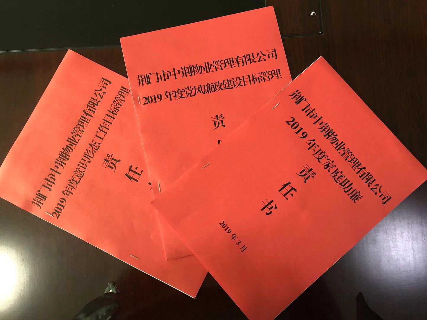 2019年3月14日,市中荊物業(yè)管理有限公司黨總支與公司各黨支部、部室、領導成員簽訂了《2019年度黨風廉政建設目標管理責任書》、《2019年度意識形態(tài)責任書》、《2019年度家庭助廉責任書》,各類責任書的簽訂,進一步明確了各項工作中的職責,把責任扛在肩上。為我公司2019年各類工作任務的落實起到了保障作用。